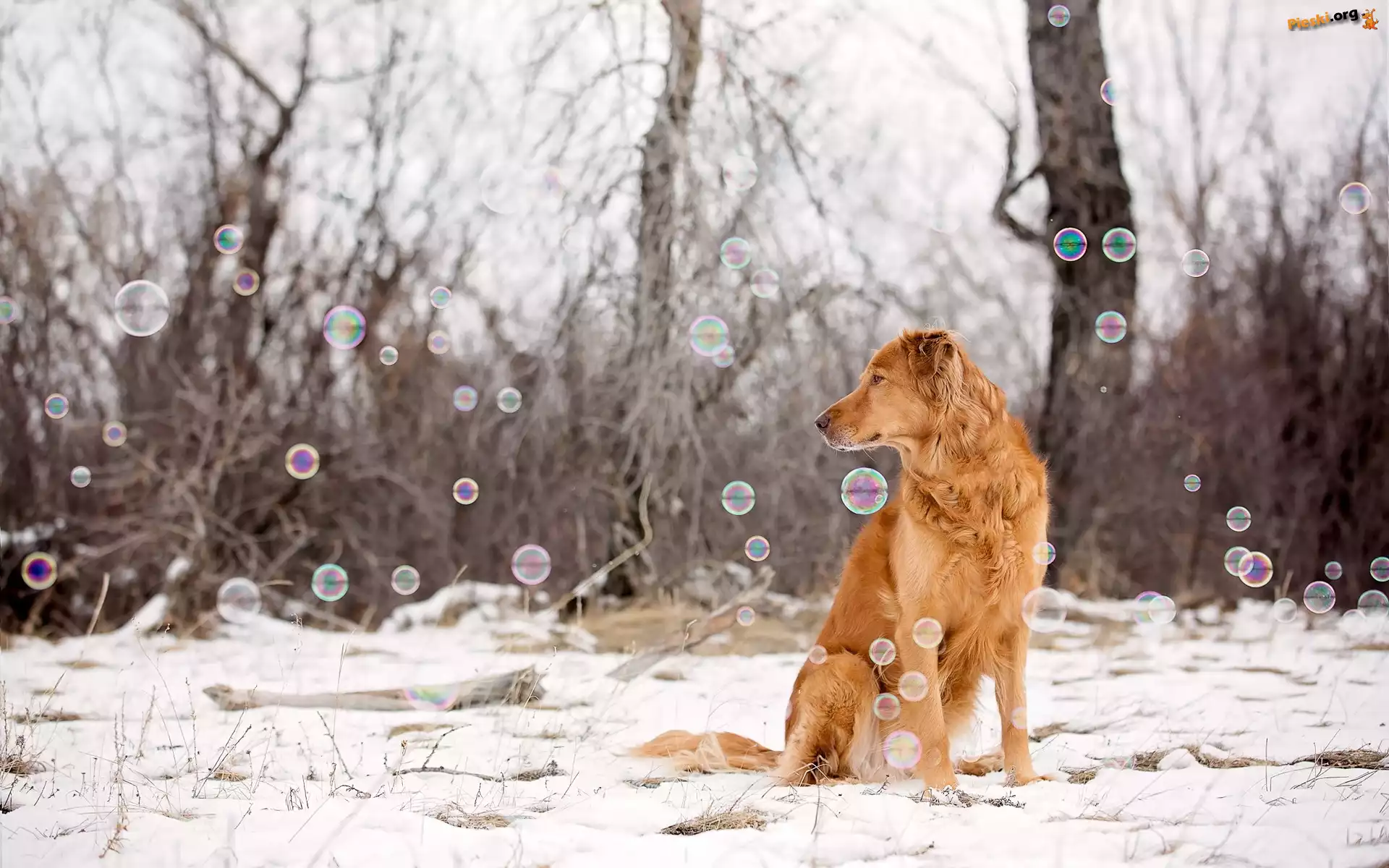Bańki, Zima, Drzewa, Pies, Mydlane