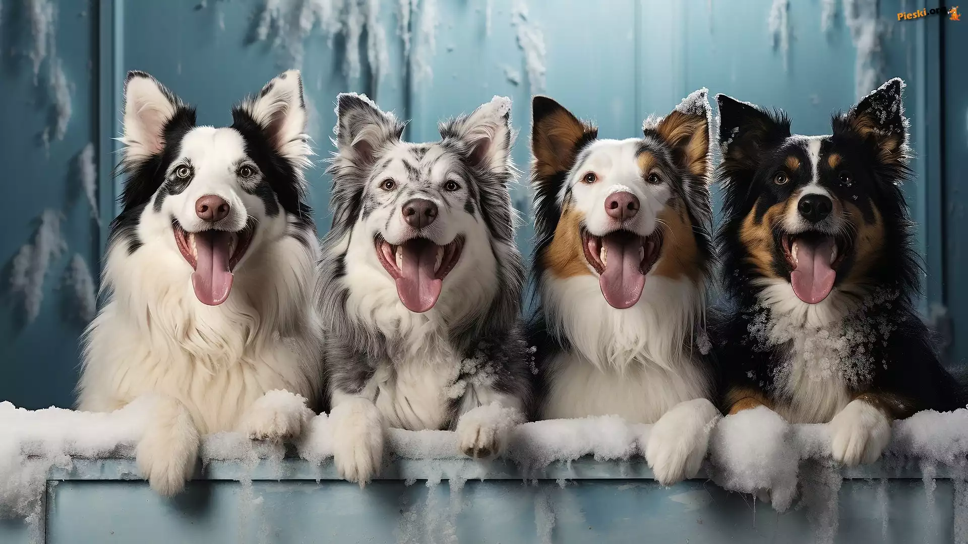 Śnieg, Psy, Border collie, Cztery, Zmarznięty, Jęzory, Pieski