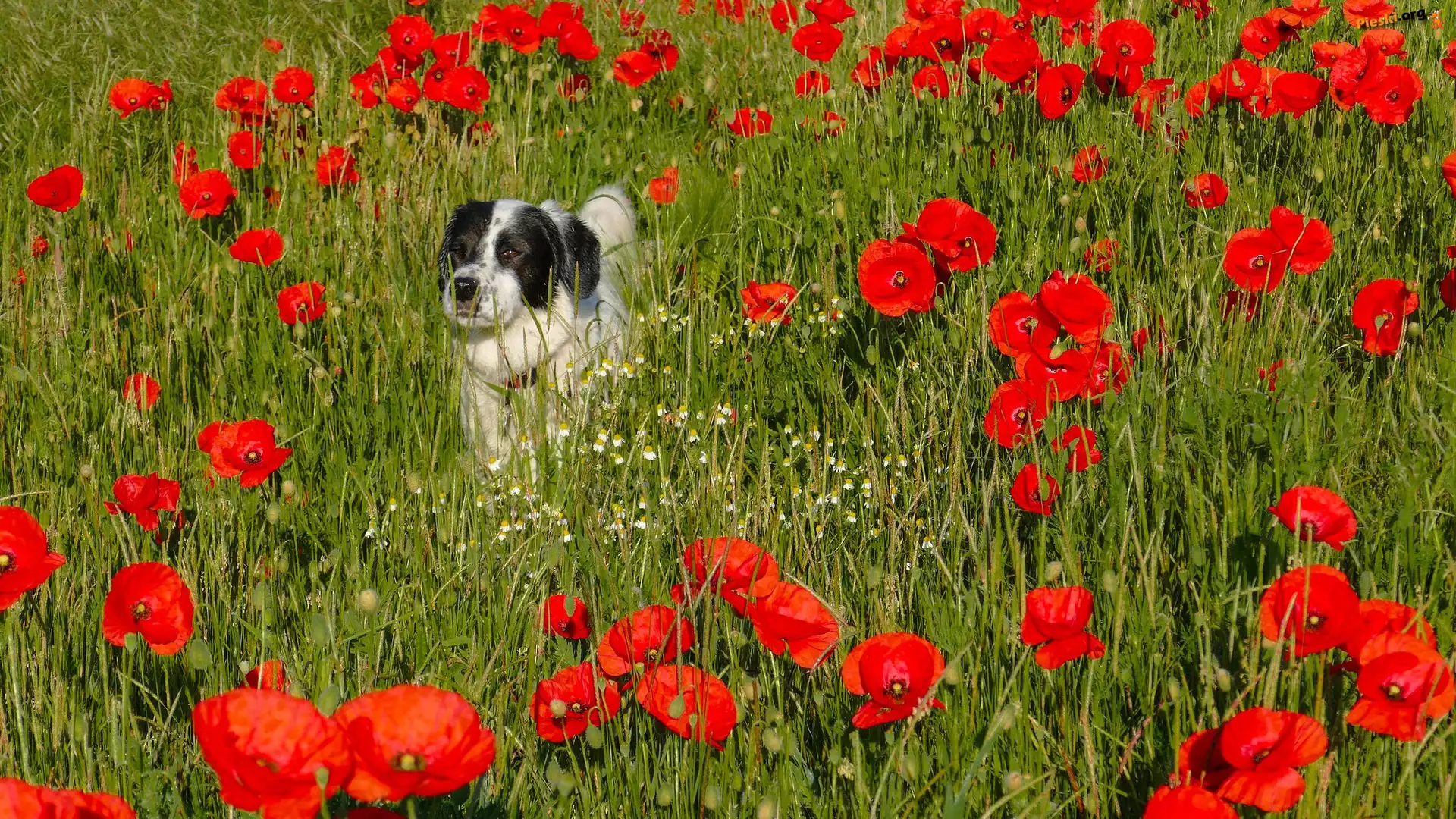 Czerwone, Pies, Czarno-biały, Kwiaty, Maki