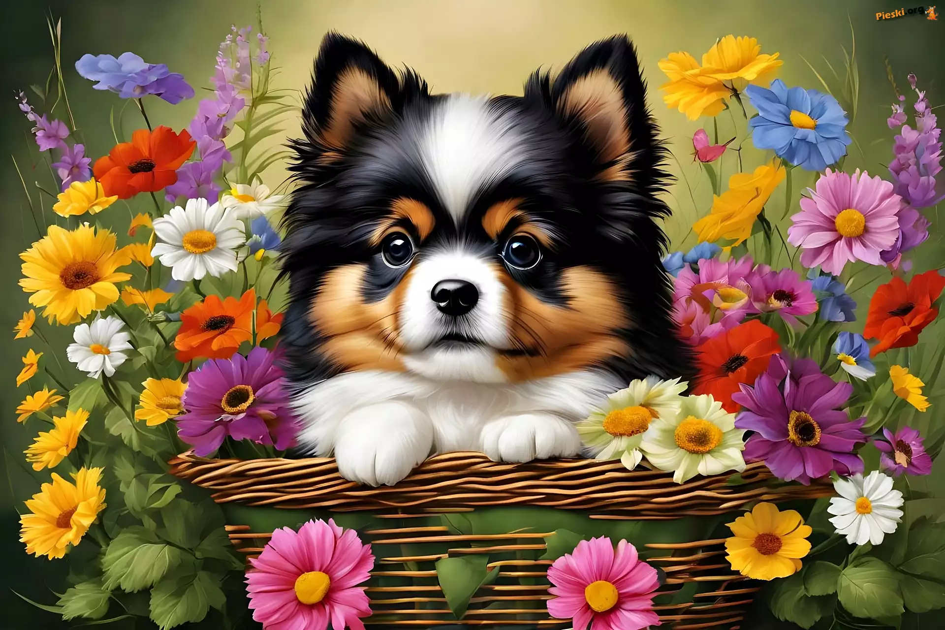 Kwiaty, Grafika, Pies, Koszyk, Szczeniak, Pieski
