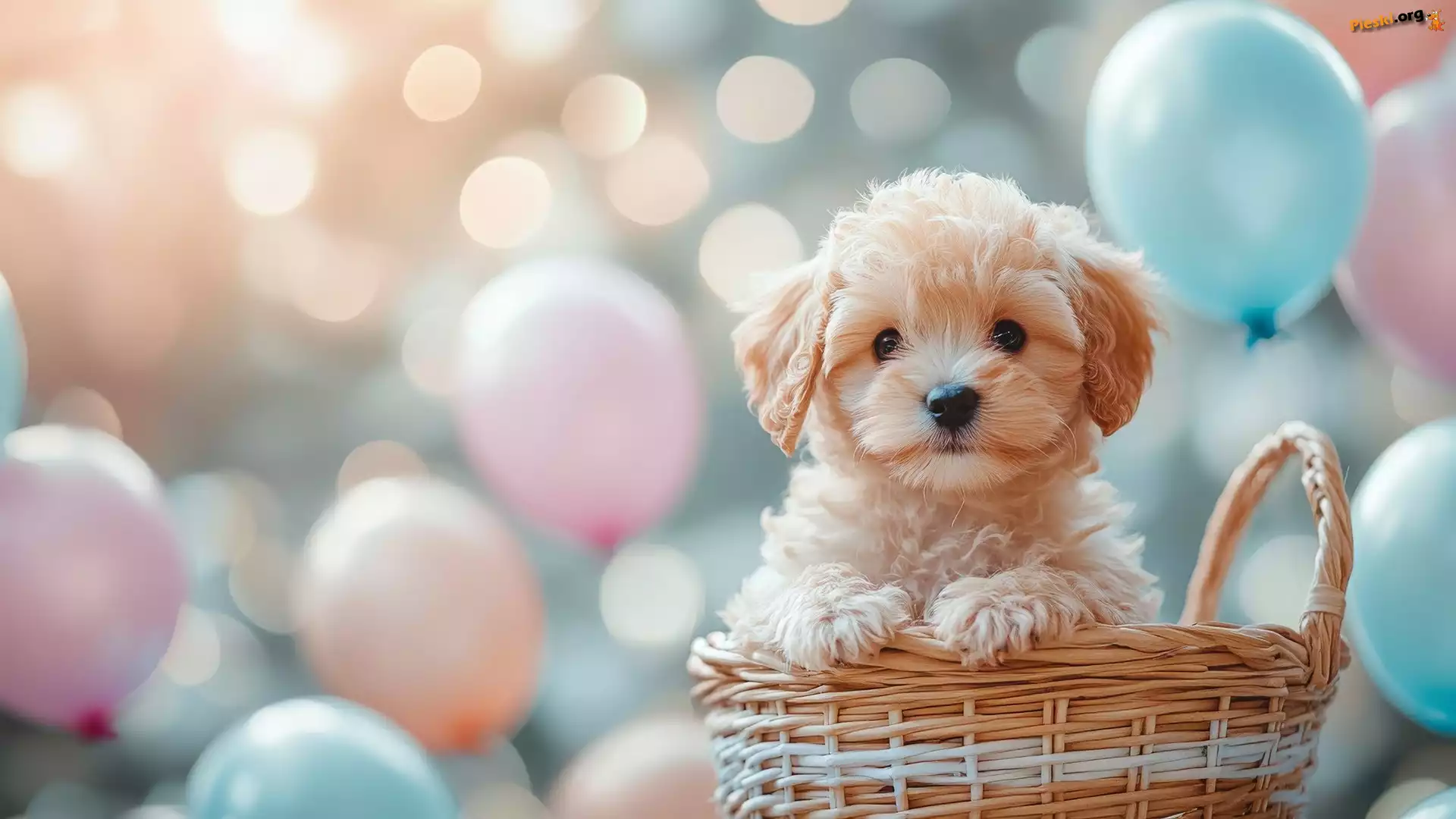 Balony, Pies, Szczeniak, Jasnobrązowy, Kolorowe, Koszyk, Pieski