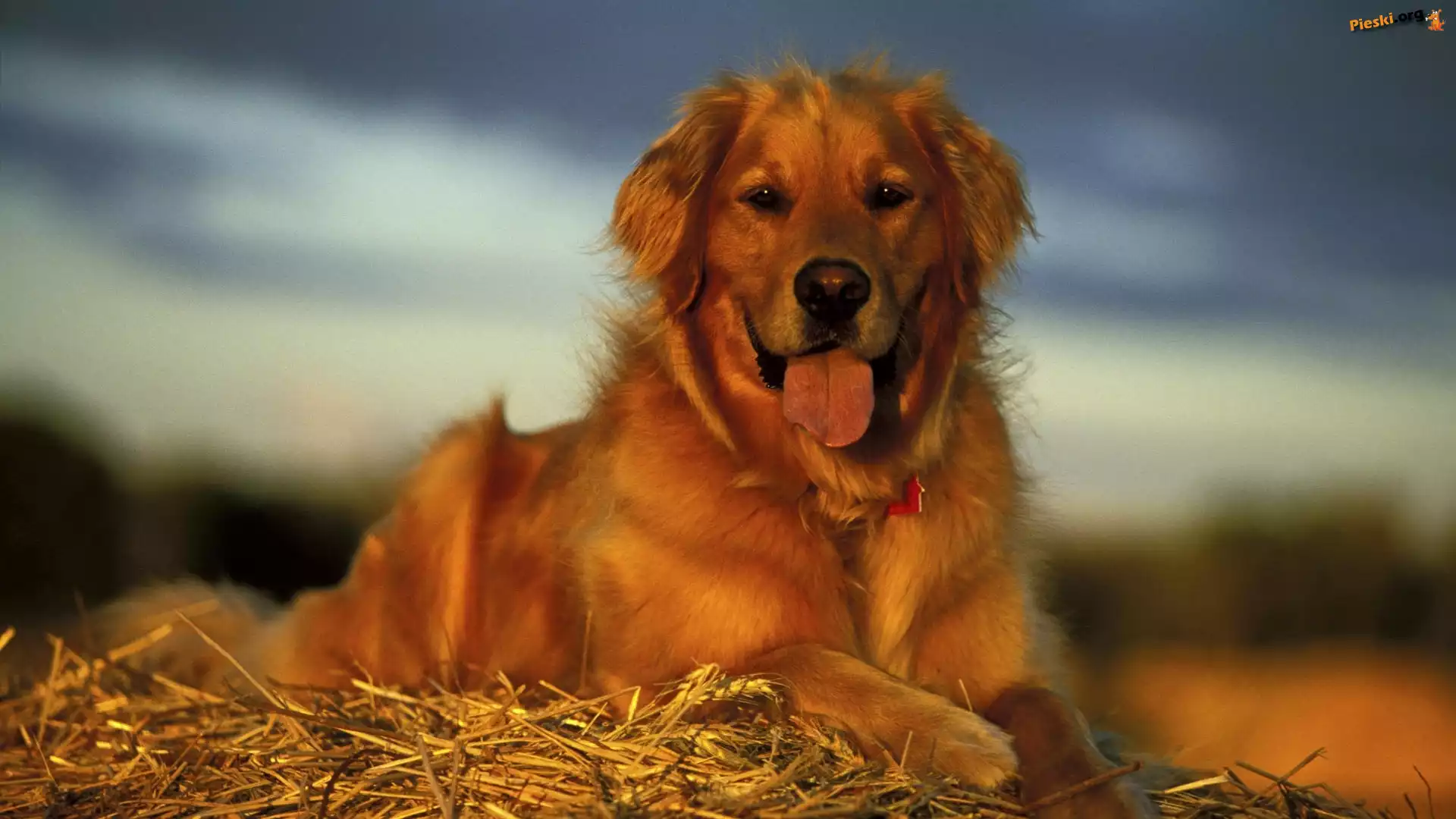 Język, Pies, Golden retriever, Słoma, Pieski
