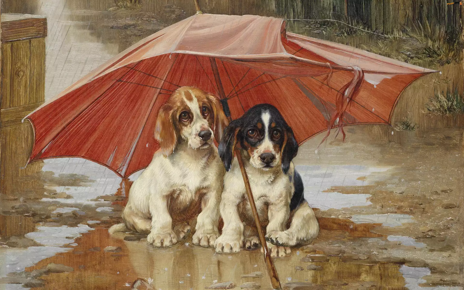 Deszcz, Malarstwo, Parasol, Wiliam Henry Hamilton Trood, Obraz, Psy, Kałuża, Pieski