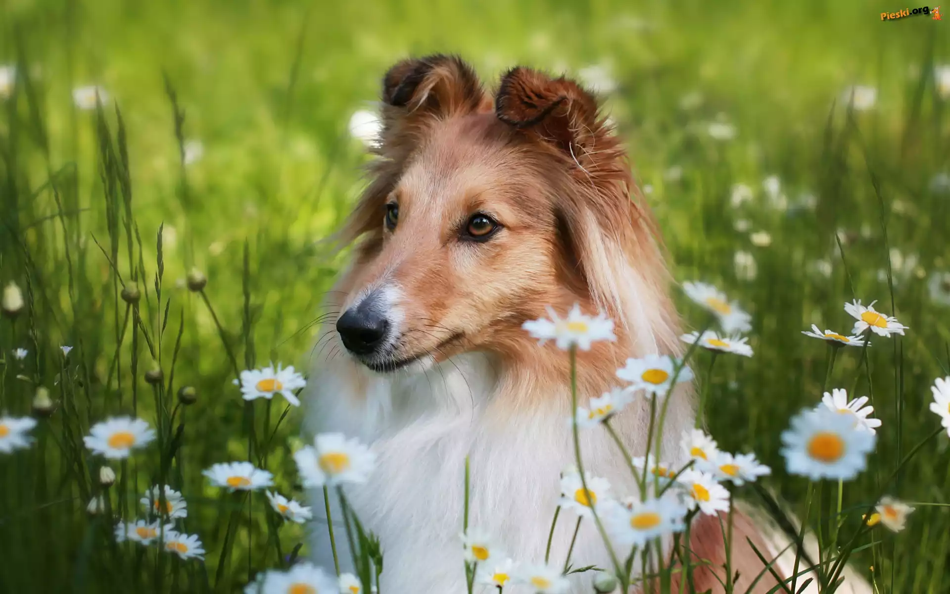 Kwiaty, Łąka, Pies, Owczarek szetlandzki