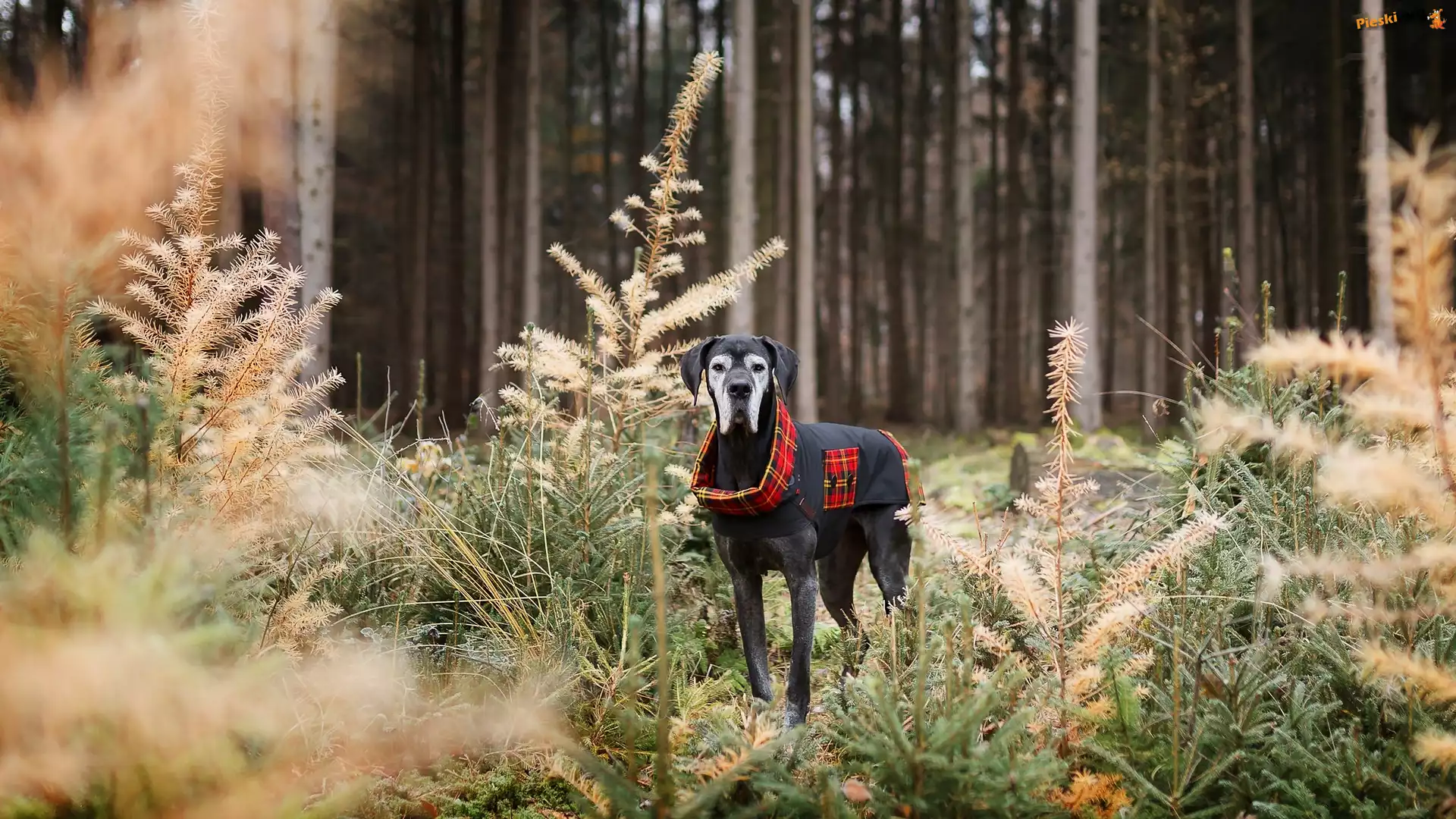 Las, Dog niemiecki, Ubranko, Drzewa, Pieski