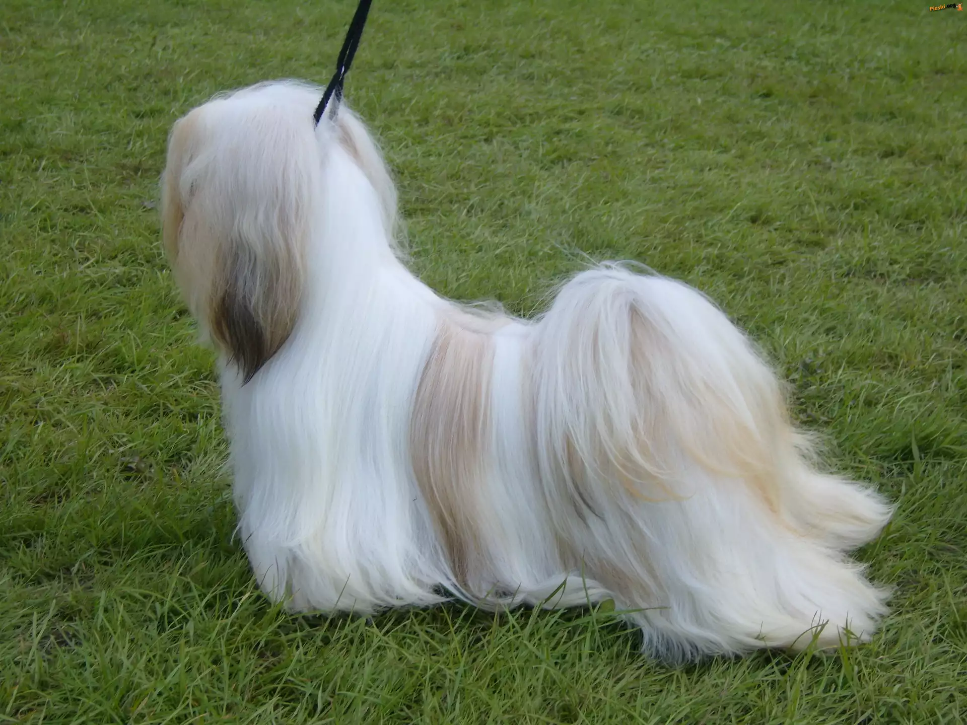 Pies, Różowa, Gerbera, Lhasa Apso Lhasa Apso, kokardka Malutki piesek, Lhasa Apso wyczesany, Lhasa Apso Lana Del Rey, Pies, Lhasa Apso