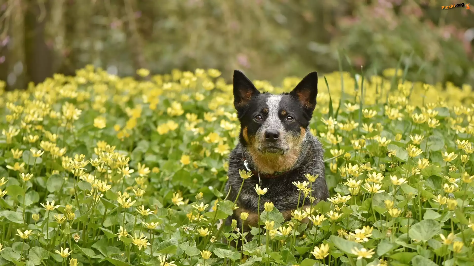 Żółte, Australian cattle dog, Pies, Łąka, Kwiaty, Pieski