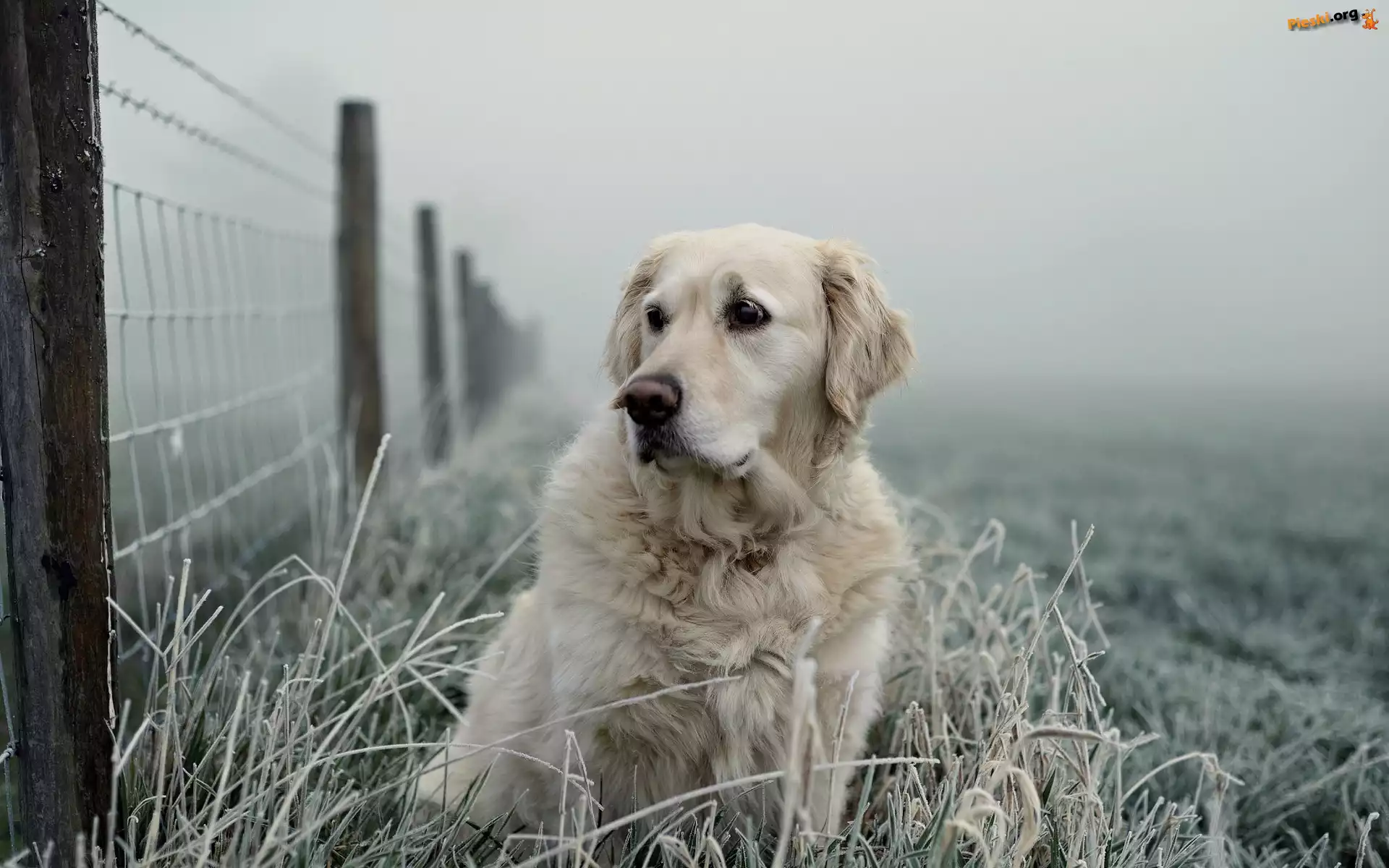 Oszroniona, Golden retriever, Płot, Trawa