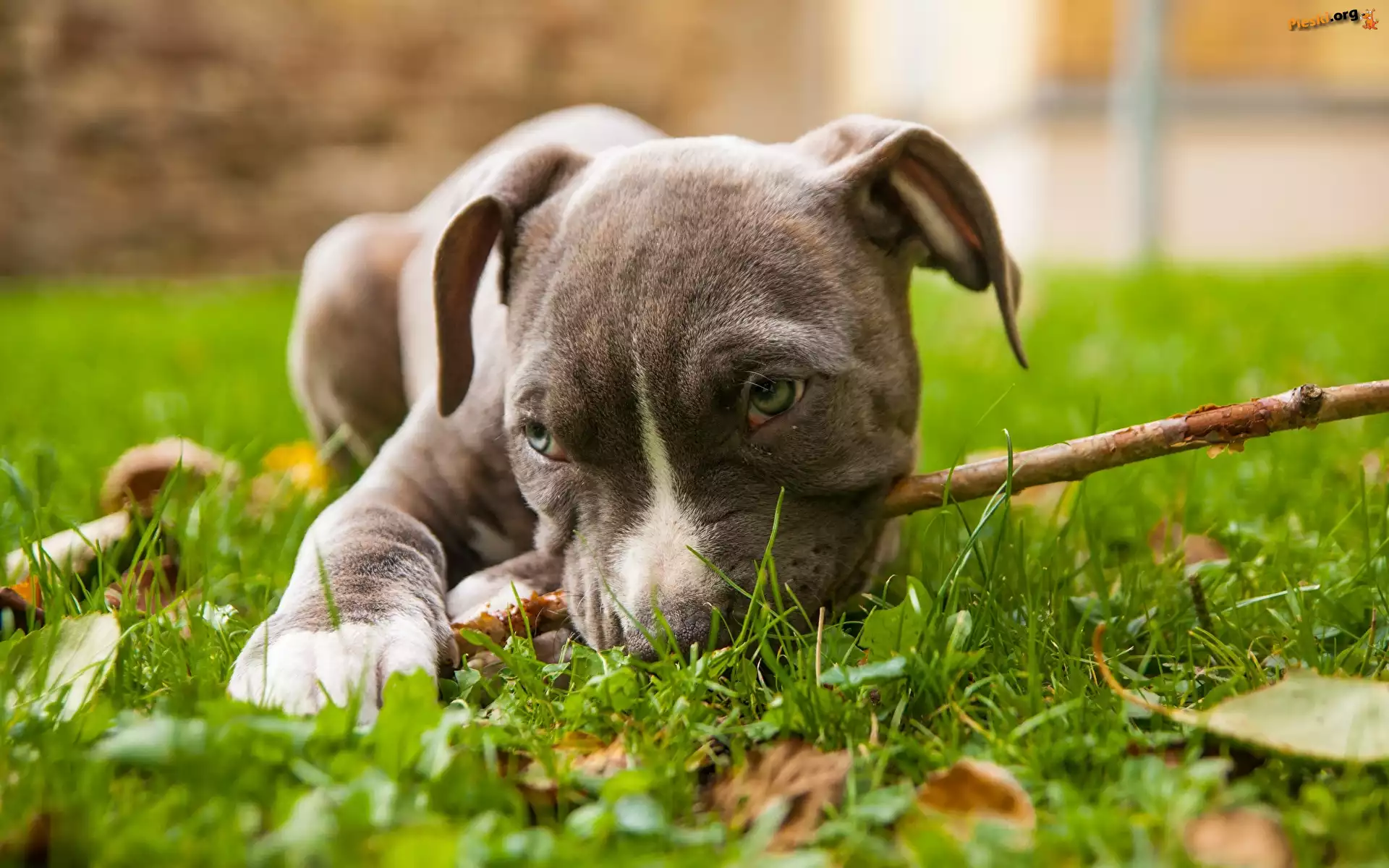 Trawa, Pies, Liście, Łąka, Amerykański staffordshire terier, Szczeniak, Amstaff, Patyk