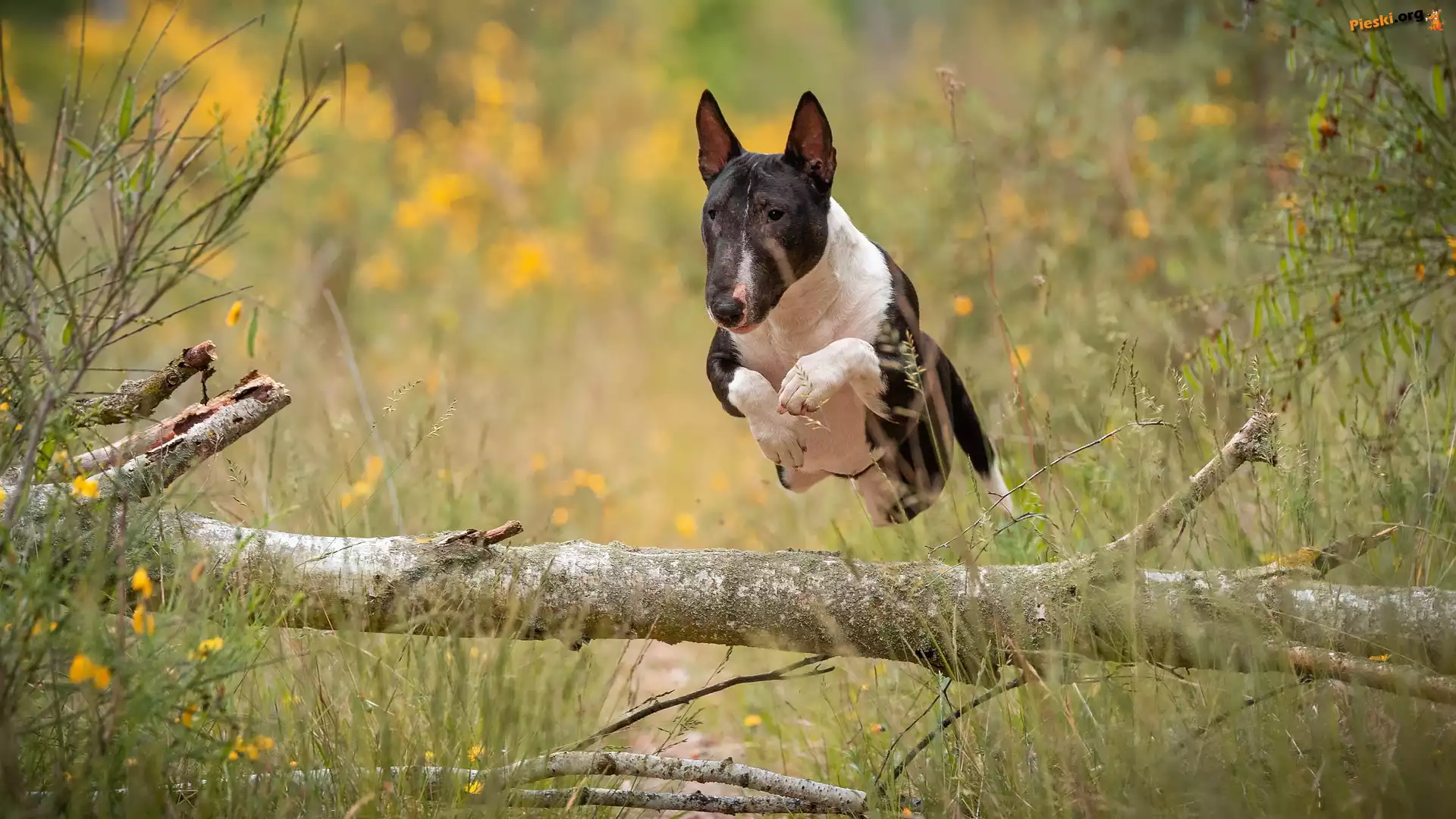 Pień, Bulterier, Pies, Skok, Kłoda