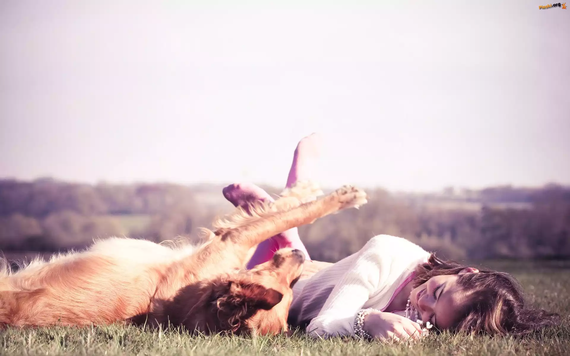 Kobieta, Pies, Łąka, Pieski