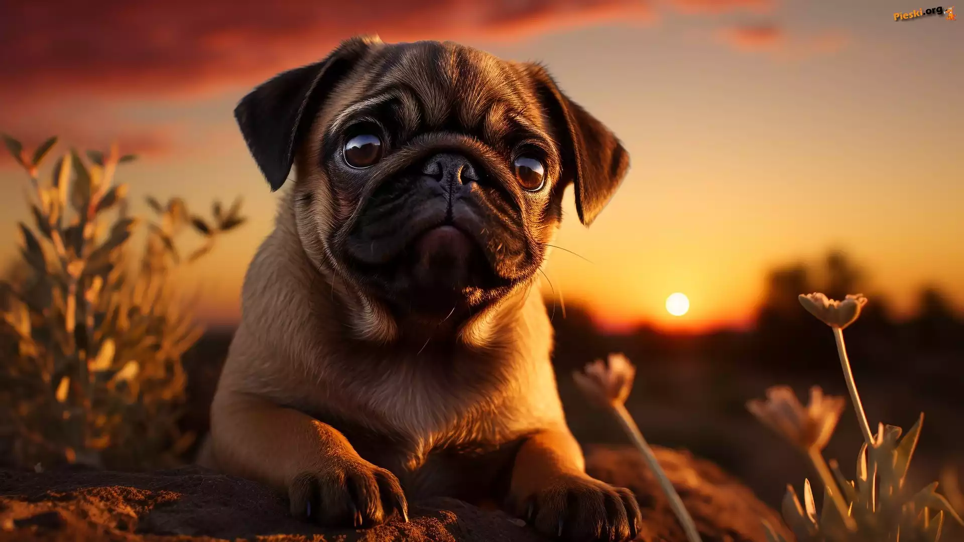Zachód słońca, AI, Pies, Rośliny, Mops, Pieski