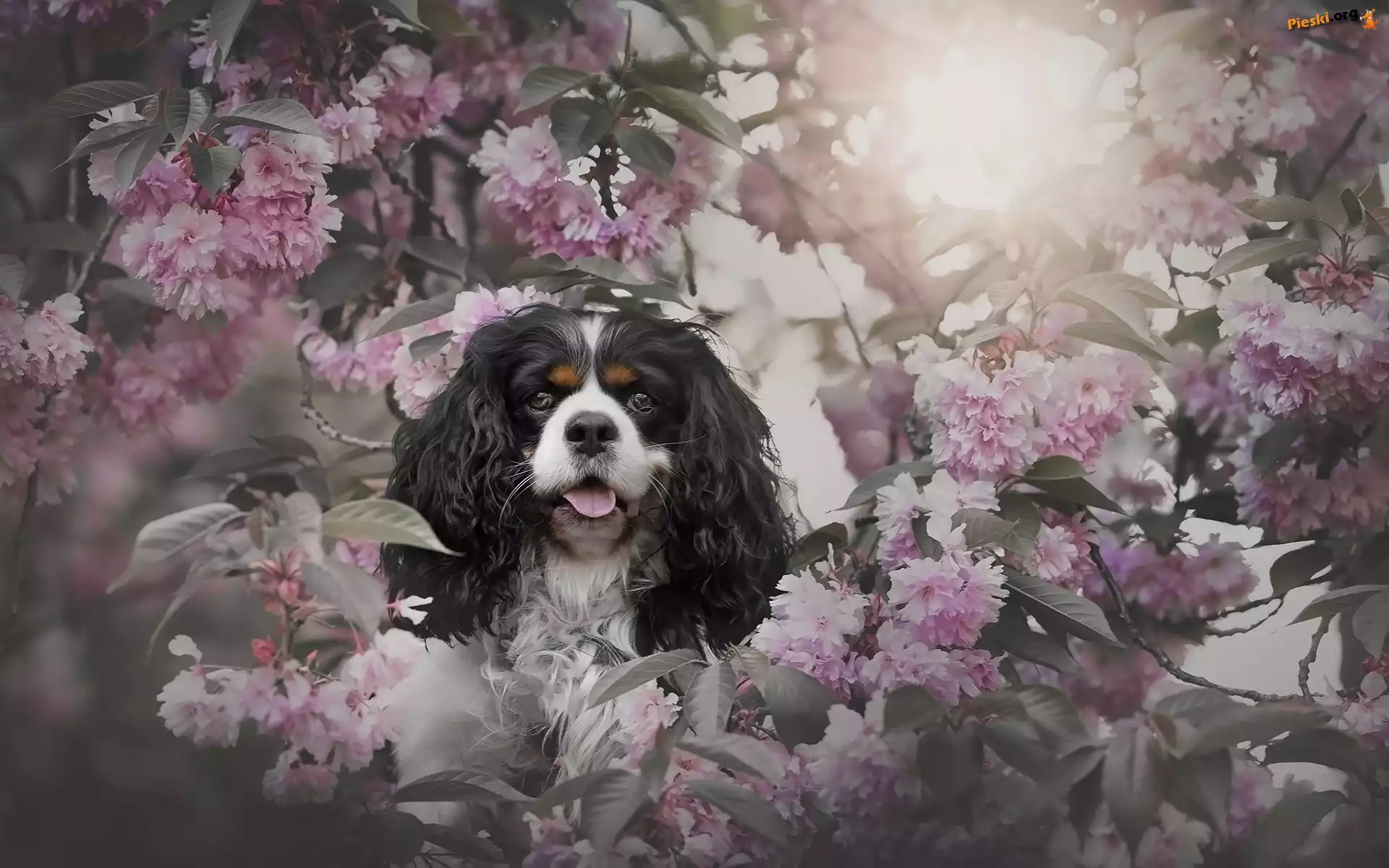 Drzewo owocowe, Pies, Wiśnia, Różowe, Cavalier king charles spaniel, Kwiaty, Gałązki, Pieski