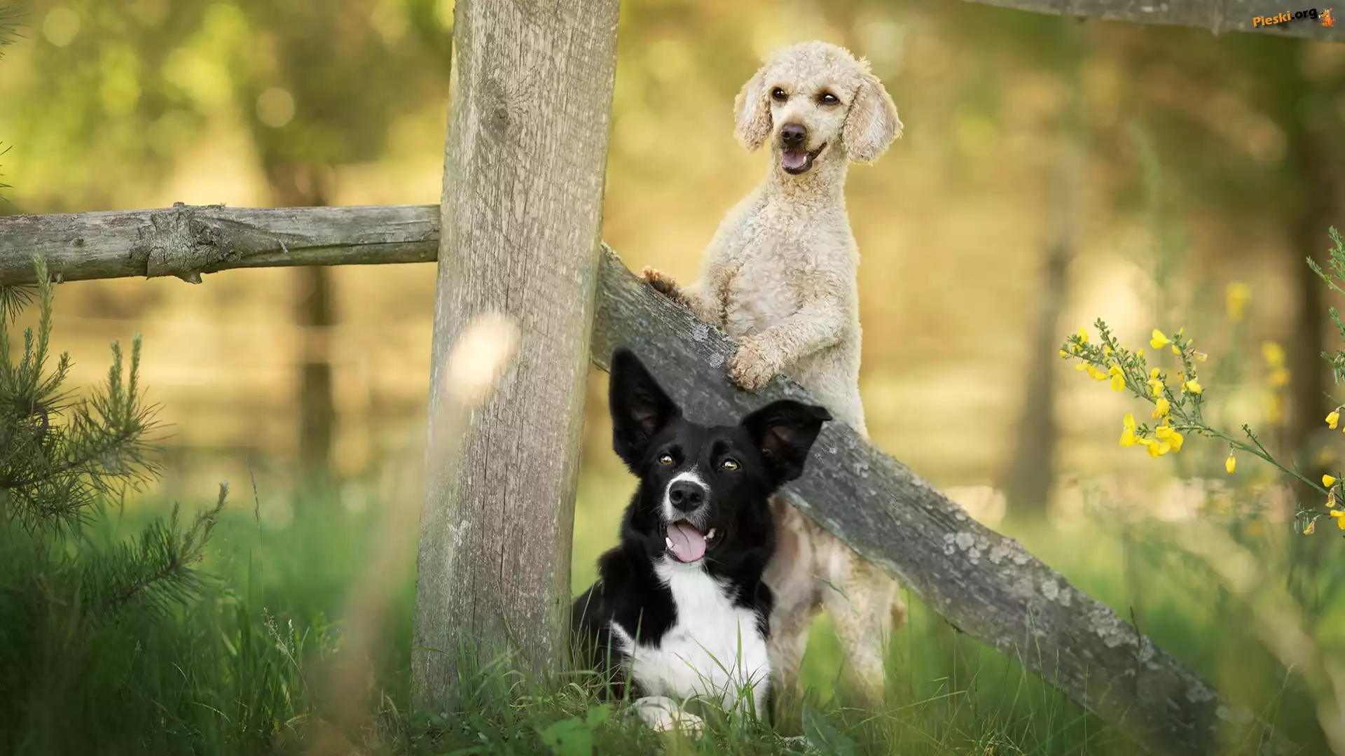 Trawa, Psy, Kwiaty, Pudel, Border collie, Płot, Rośliny, Pieski