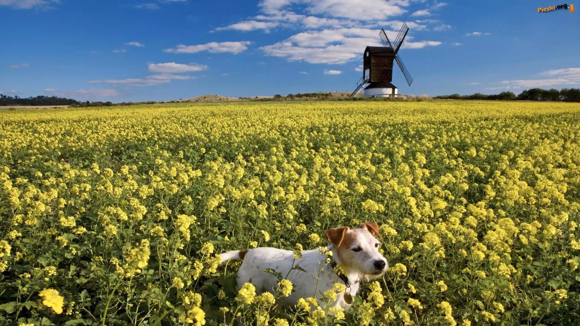 Rośliny, Pies, Pole, Wiatrak, Pieski