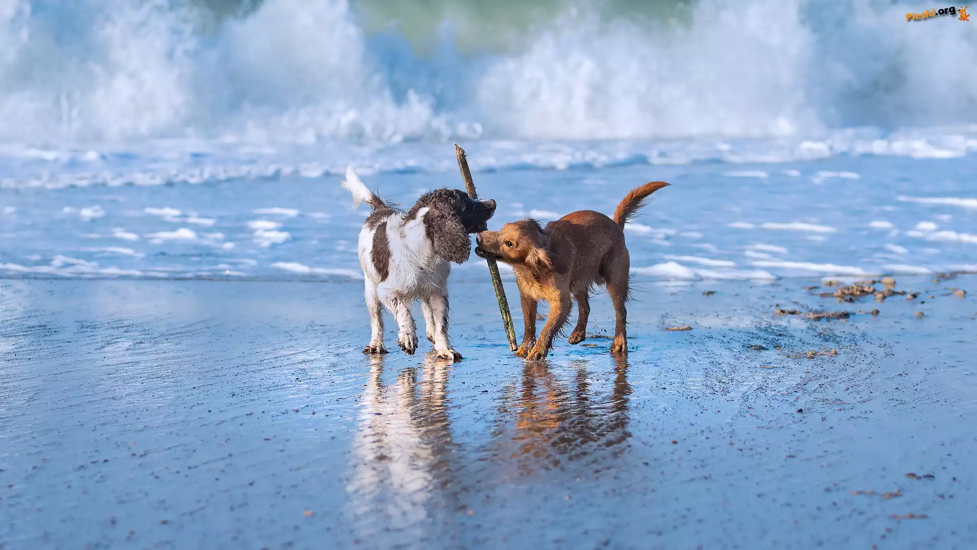Zabawa, Dwa, Kij, Fala, Springer spaniel angielski, Psy, Working cocker spaniel, Morze