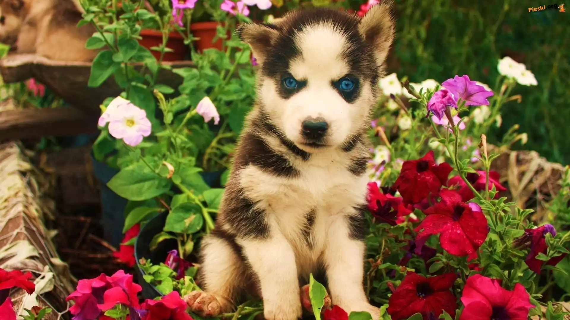 Szczeniak, Siberian Husky, Kwiatki, Pieski