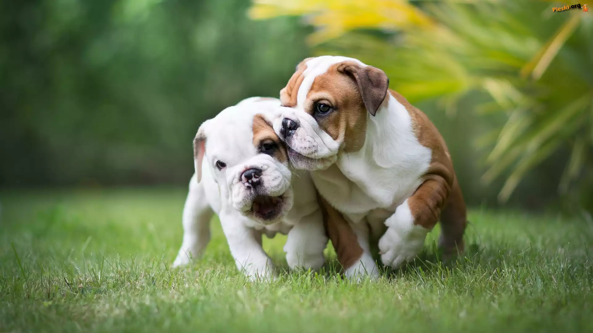 Szczeniaki, Psy, Dwa, Buldogi angielskie, Trawa, Pieski