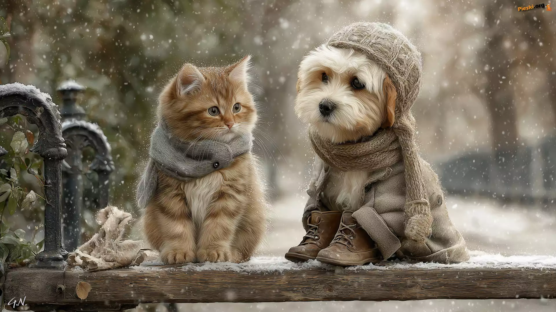 Grafika AI, Kot, Ubranka, Pies, Zima, Ławka, Pieski
