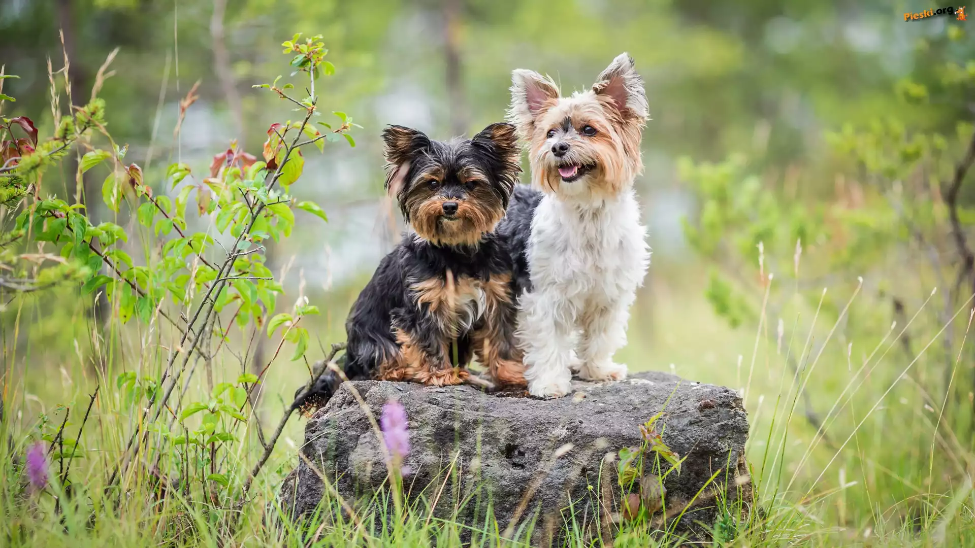 Yorkshire terrier, Dwa, Psy, Kamień, Pieski
