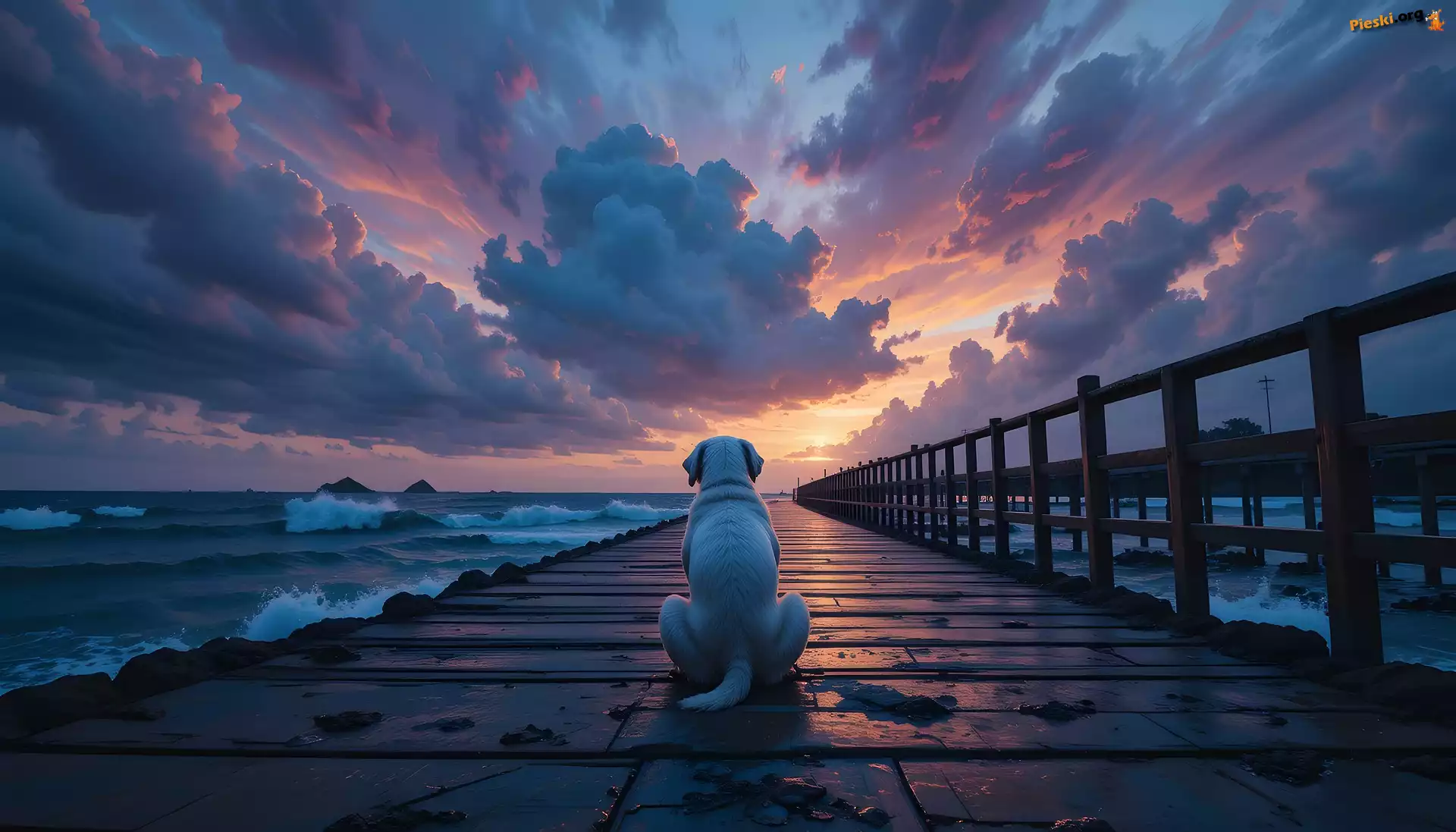 Pomost, Chmury, Morze, Zachód słońca, Pies, Pieski